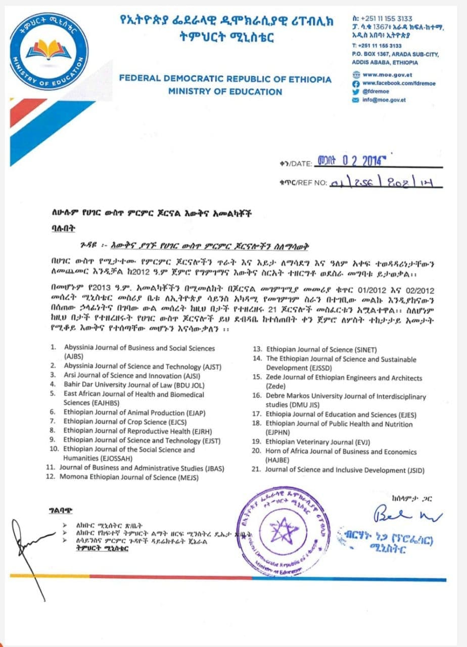 በ2013 ዓ.ም.ለትምህርት ሚኒስቴር ያመለከቱና እውቅና የተሰጣቸው የሃገር ውሰጥ የምርምር ጆርናሎች